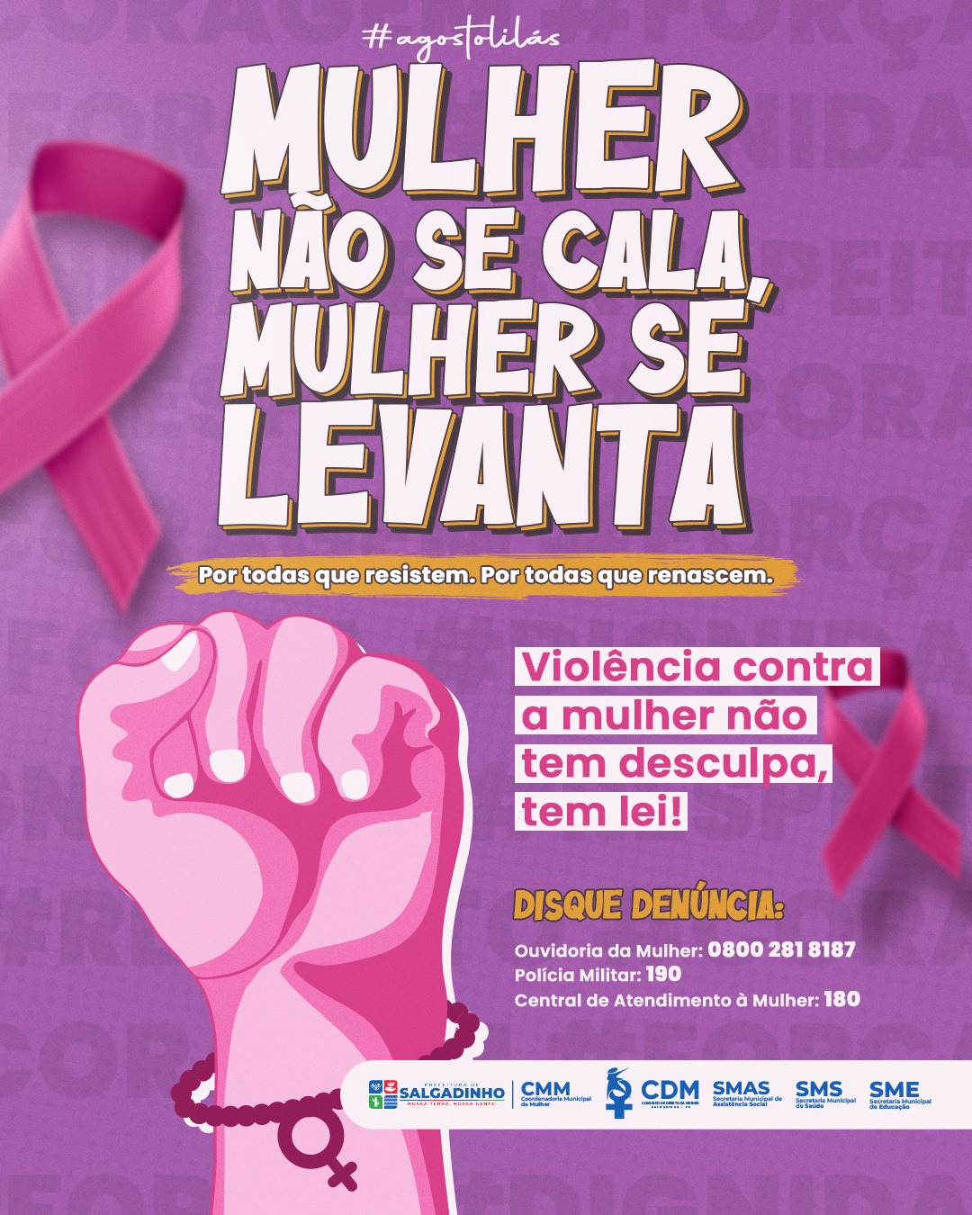 O Governo Municipal deSalgadinho, vem através desse convidar toda a população para juntos participar da comemoração dos 11 anos da Lei Maria da Penha. O Evento será realizado pela Diretoria da Mulher do Município e terá parceria com o Sindicato dos Trabalhadores Rurais.