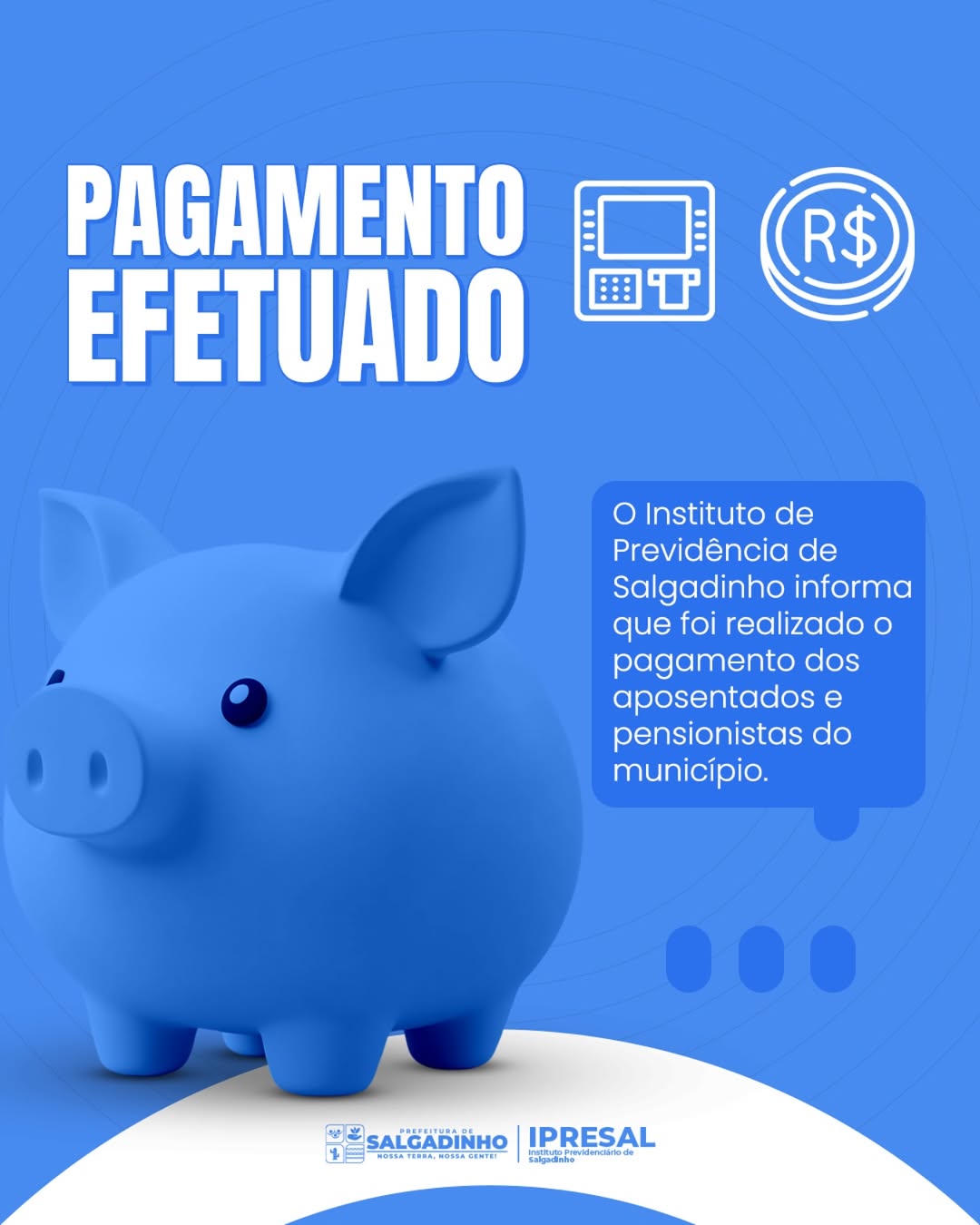 A Prefeitura de Salgadinho, por meio do Instituto de Previdência dos Servidores (IPRESAL), informa que o pagamento do 13º salário aos aposentados e pensionistas do município já foi efetuado.