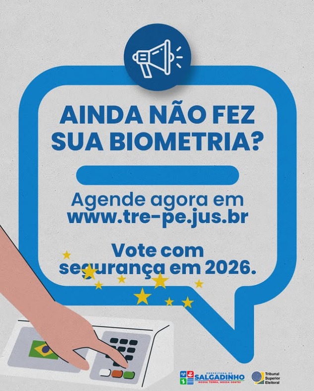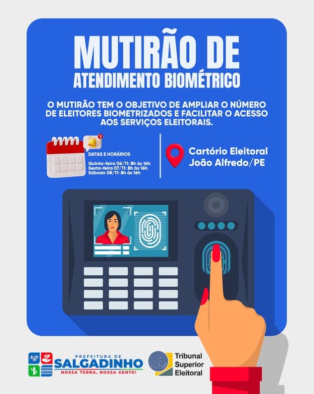 A Prefeitura de Salgadinho informa aos eleitores do município que, nos dias 6, 7 e 8 de novembro, o Tribunal Regional Eleitoral de Pernambuco promoverá um Mutirão de Atendimento Biométrico em todo o estado.