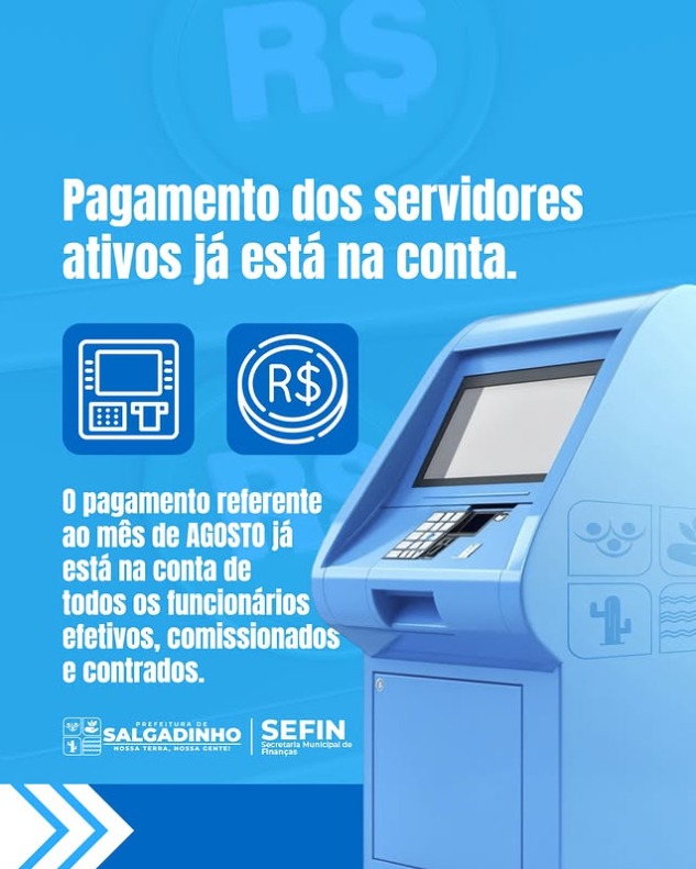 A Prefeitura de Salgadinho informa que o pagamento referente ao mês de novembro já foi creditado na conta de todos os servidores municipais, incluindo efetivos, comissionados e contratados.