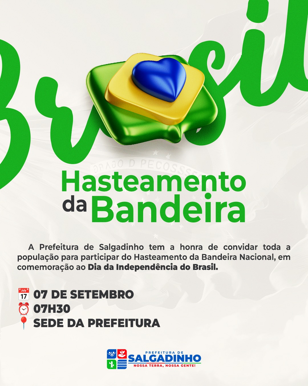 O Governo Municipal de Salgadinho, convida toda população para o Desfile Cívico de Independência do Brasil, que será Domingo, dia 10 de Setembro.