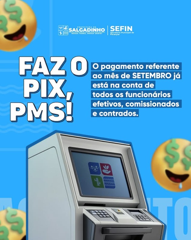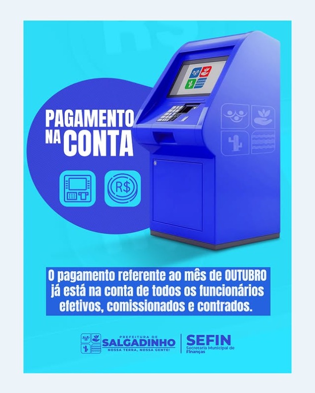 A Prefeitura de Salgadinho informa que o pagamento referente ao mês de outubro já foi creditado na conta de todos os servidores do município, incluindo efetivos, comissionados e contratados.