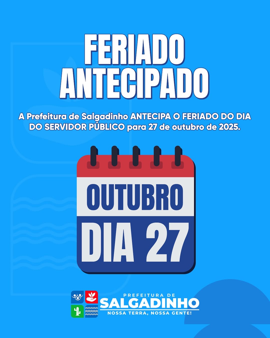 A Prefeitura de Salgadinho informa à população que, em razão das datas comemorativas de final de ano, foram definidos pontos facultativos para os feriados no âmbito da administração pública municipal, conforme calendário divulgado.