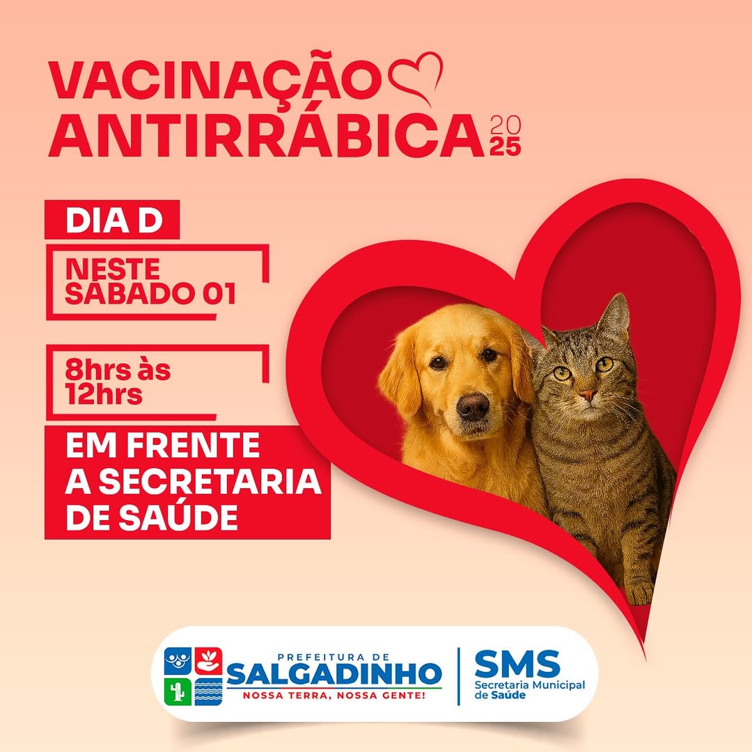A Prefeitura de Salgadinho, por meio da Secretaria Municipal de Saúde, realizará neste sábado, dia 31, o Dia D da Vacinação Antirrábica 2025, com o objetivo de proteger cães e gatos e prevenir a raiva no município.