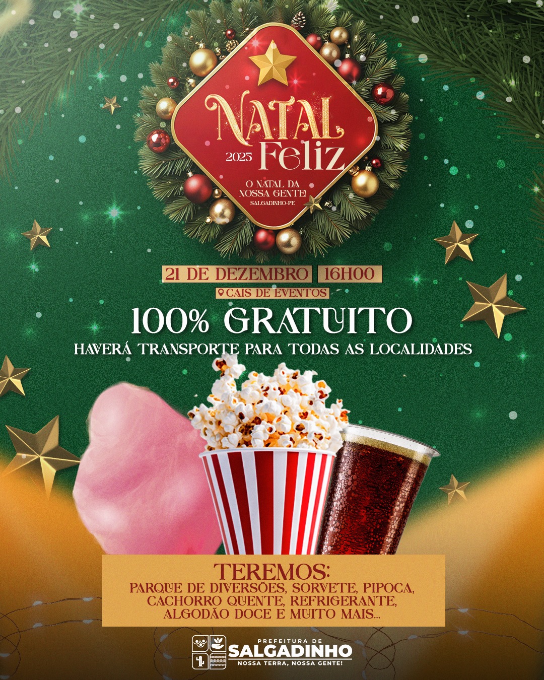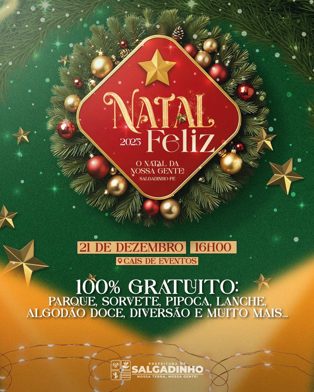 A Prefeitura de Salgadinho convida toda a população para participar do Natal Feliz 2025 – O Natal da Nossa Gente, uma tarde especial repleta de alegria, união e atividades para toda a família.