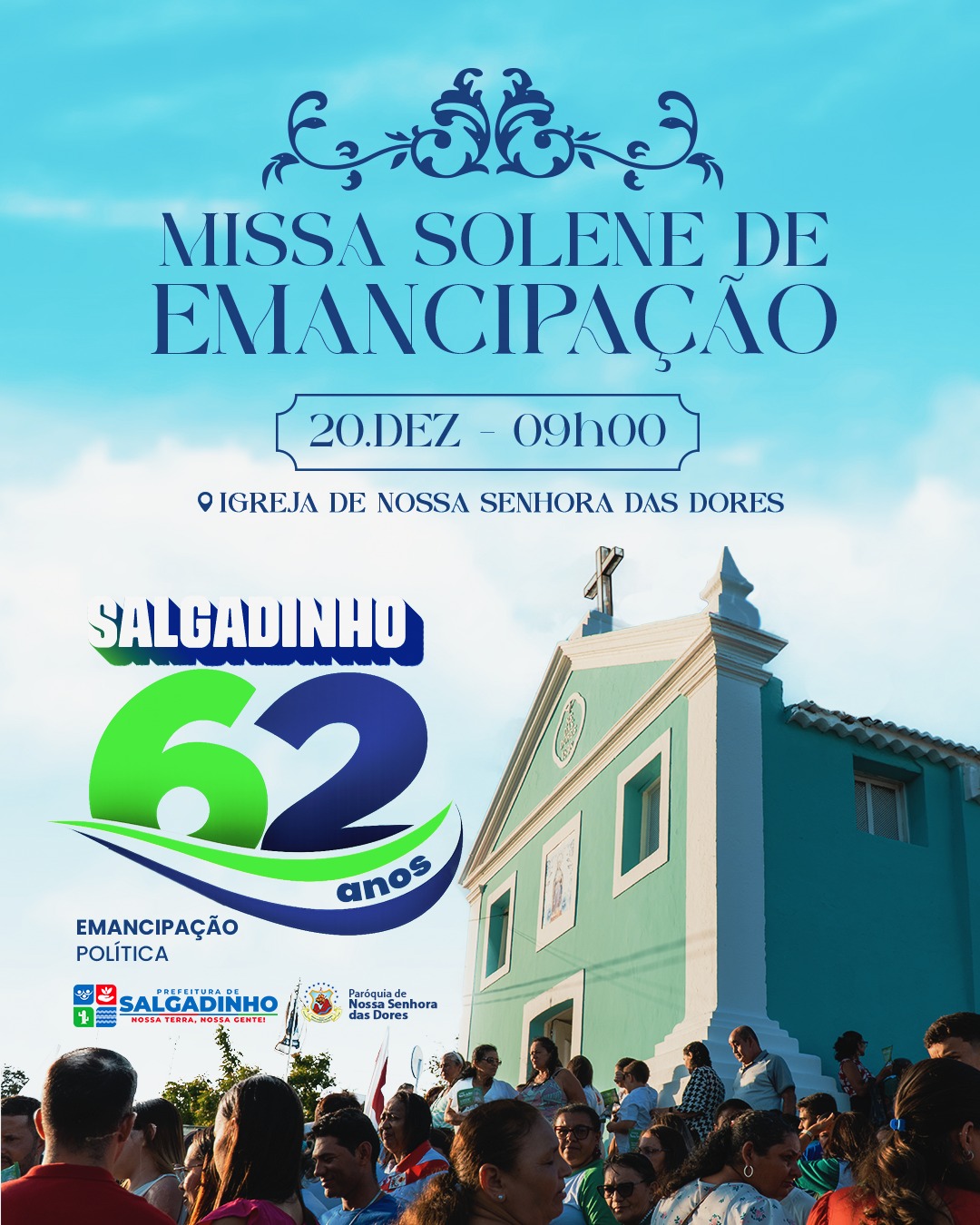 Em comemoração aos 62 anos de Emancipação Política de Salgadinho, a Prefeitura convida toda a população para participar da Missa Solene, um momento de fé, gratidão e reflexão sobre a história do município.