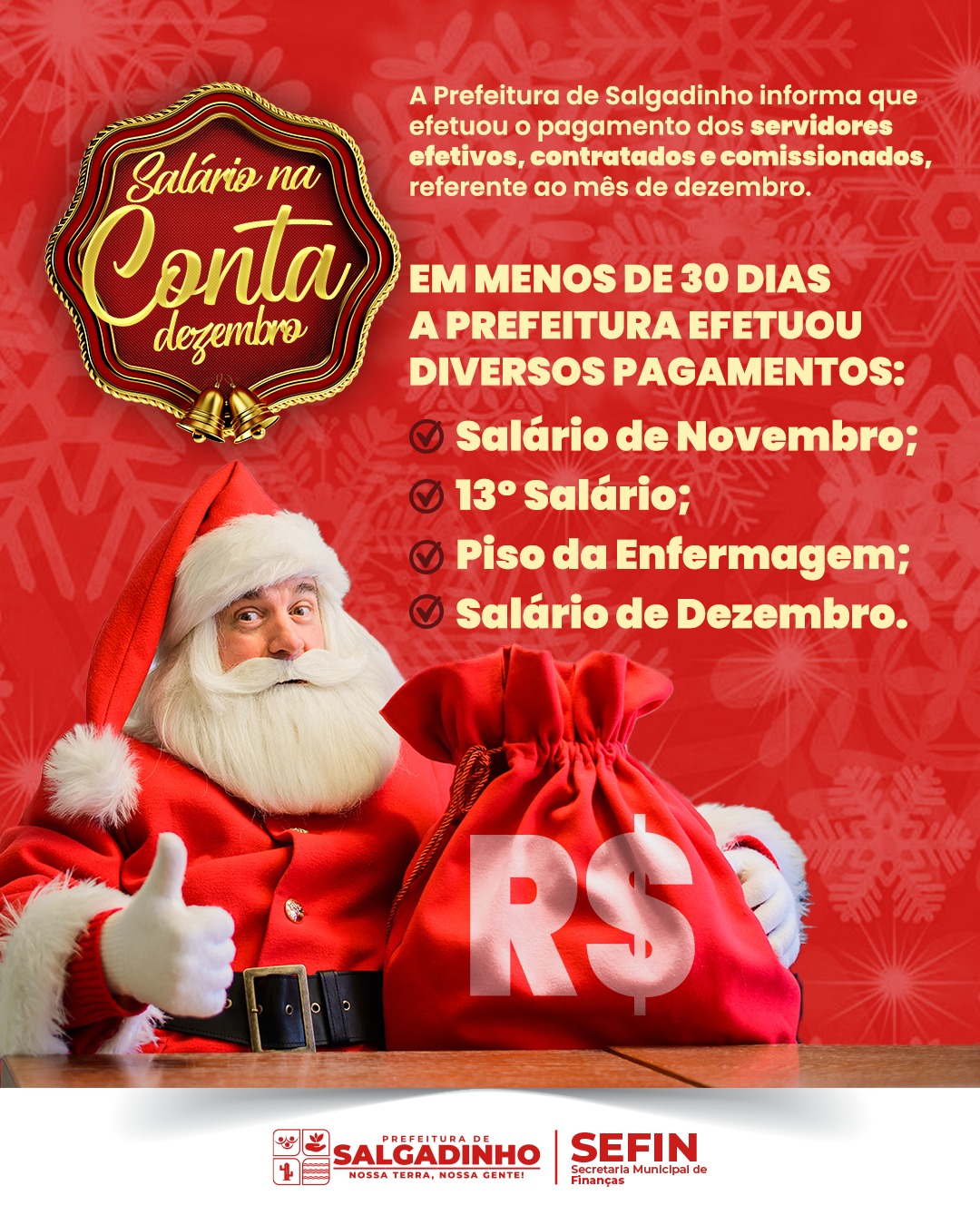 A Prefeitura de Salgadinho, por meio da Secretaria Municipal de Finanças (SEFIN), informa que o pagamento do 13º salário já foi creditado na conta de todos os servidores municipais, incluindo efetivos, comissionados e contratados.