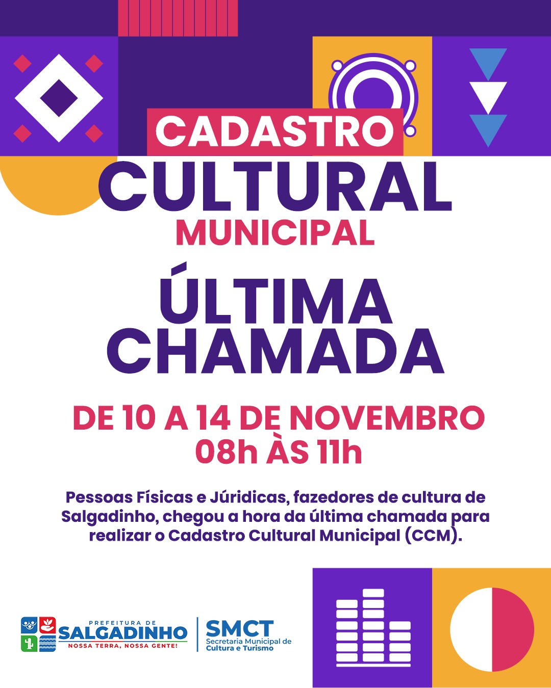 A Prefeitura de Salgadinho, por meio da Secretaria Municipal de Cultura e Turismo, informa que será realizada a última chamada para o Cadastro Cultural Municipal, voltado aos fazedores e fazedoras de cultura do município.