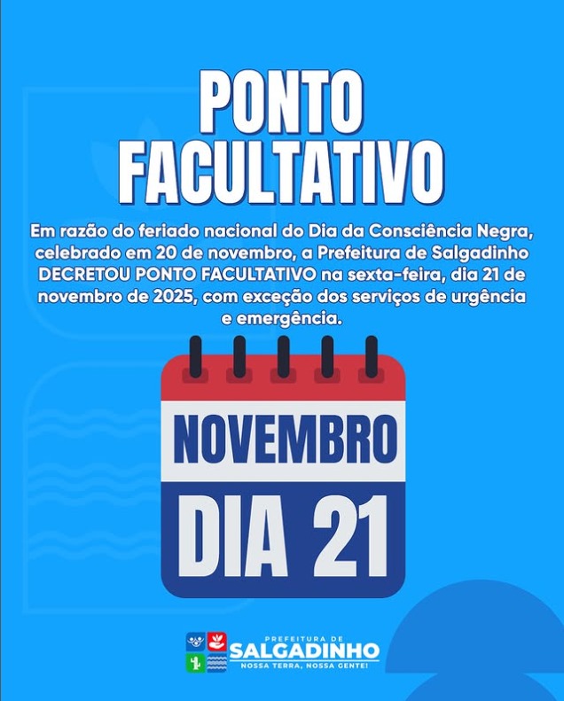 A Prefeitura de Salgadinho informa que, em razão do feriado do Dia da Consciência Negra, celebrado em 20 de novembro, foi decretado ponto facultativo na sexta-feira, dia 21 de novembro de 2025.