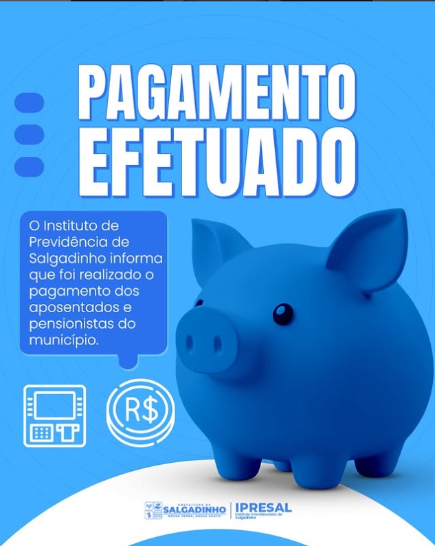 A Prefeitura de Salgadinho informa que o pagamento referente ao mês de outubro já foi creditado na conta de todos os servidores do município, incluindo efetivos, comissionados e contratados.