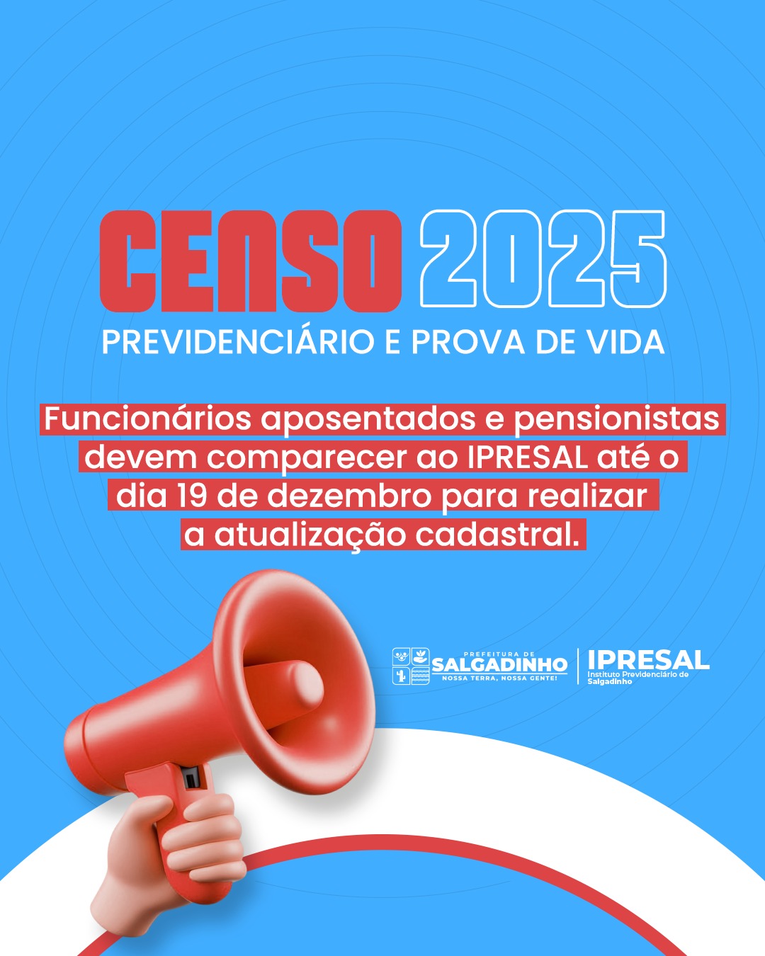 A Prefeitura de Salgadinho, por meio do Instituto de Previdência do Município (IPRESAL), informa que todos os servidores aposentados e pensionistas devem realizar a atualização cadastral referente ao Censo Previdenciário e à Prova de Vida 2025.